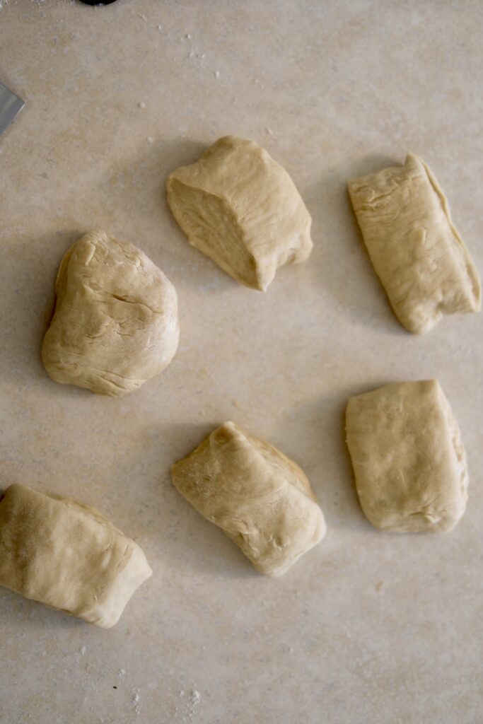 Step 8: with a bench scraper or knife, cut the dough into 9-10 proportional pieces.