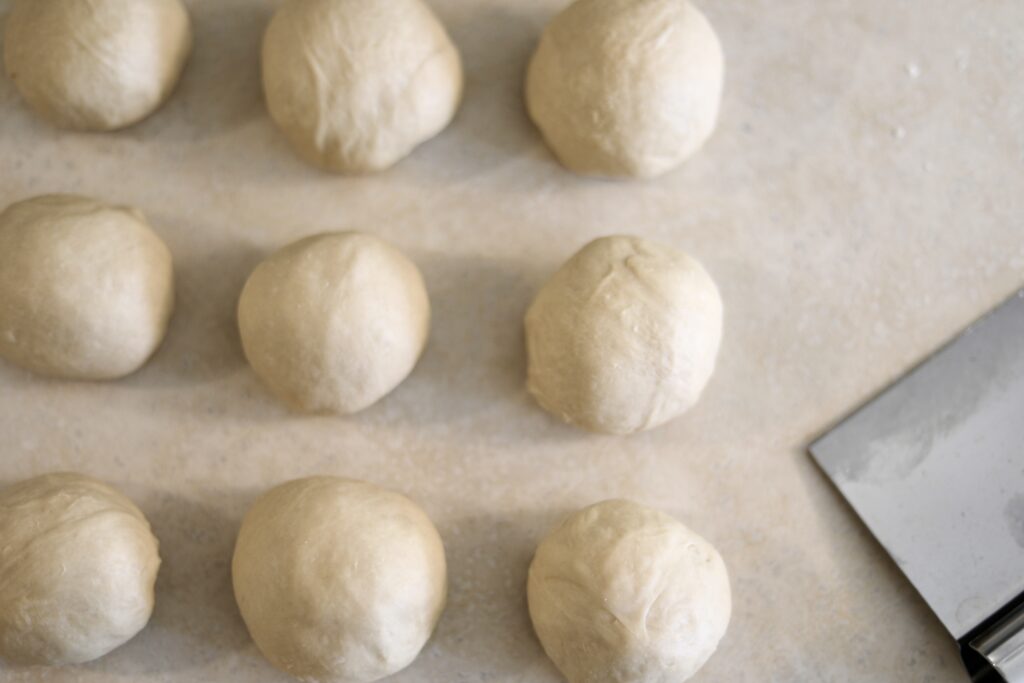 Step 9: shape your dough into round balls by pulling into a ball, pinching the bottom, and rolling the dough near you (as you would when shaping a round sourdough loaf).