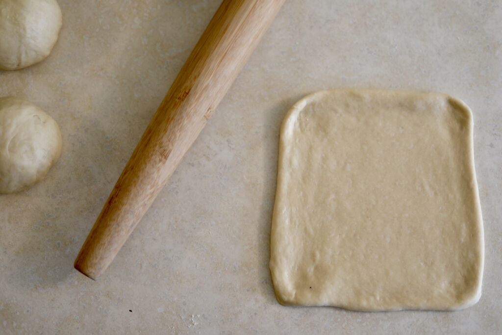 - With a rolling pin, roll each ball into a square (about 4"x5"). Once shaped into a square, roll the dough up to create a nice long log.