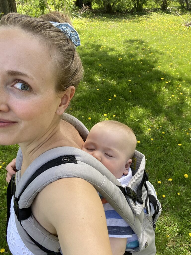 - Protects baby’s head shape: Babywearing reduces the risk of positional plagiocephaly, a condition that can affect the shape of a baby’s head, due to the decreased time babies spend lying on their backs or with their heads resting on flat surfaces